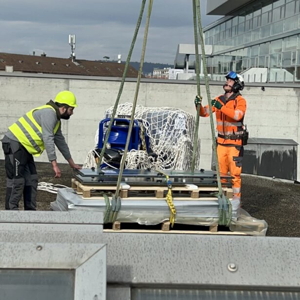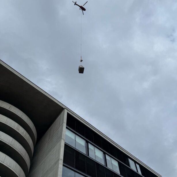 Die Herausforderung: Die Installation der neuen Ventilatoren auf dem Dach war ohne Kran oder Treppenhaus schwer möglich. Als innovative Lösung setzten wir einen Helikopter der Swiss Helicopter AG ein, der die alten Bauteile abtransportierte und die neuen Komponenten direkt aufs Dach lieferte. In enger Zusammenarbeit mit der Swiss Helicopter AG, spezialisierten Partnerfirmen, Behörden und der Flugsicherung wurde das Projekt sicher und effizient umgesetzt.