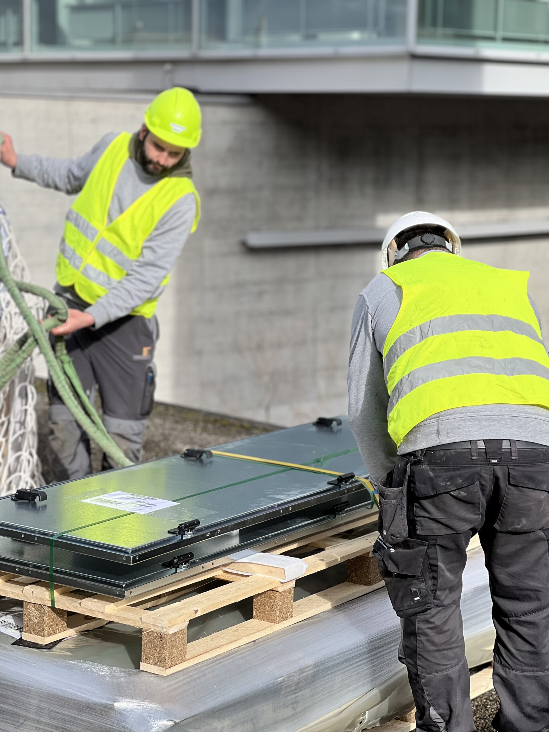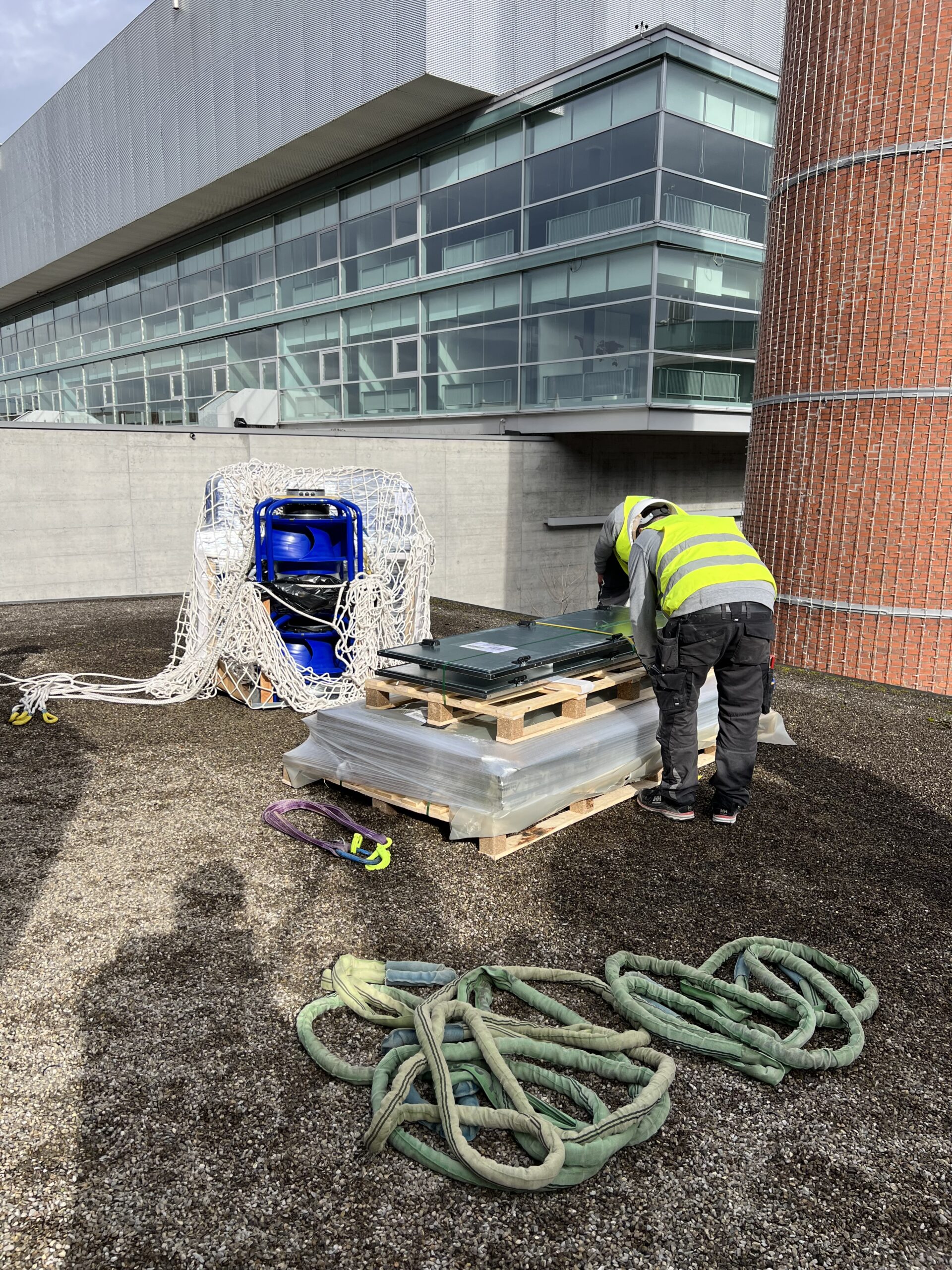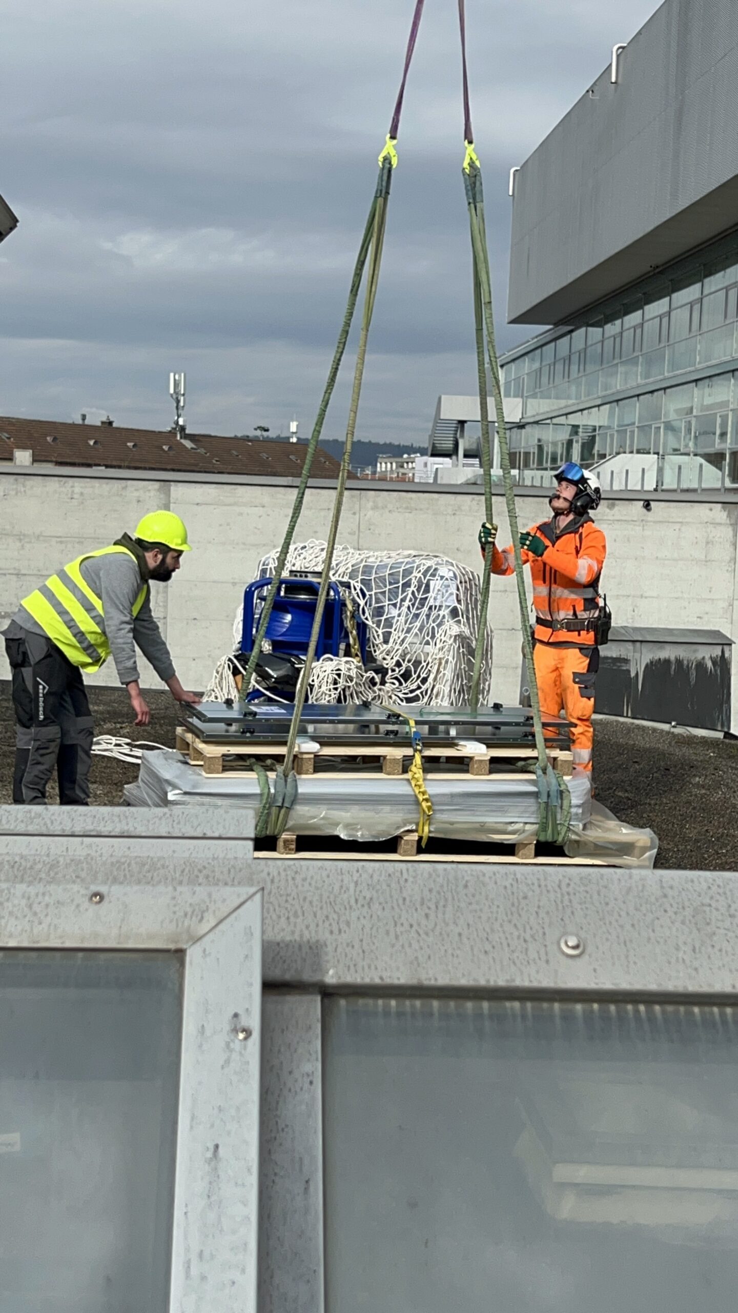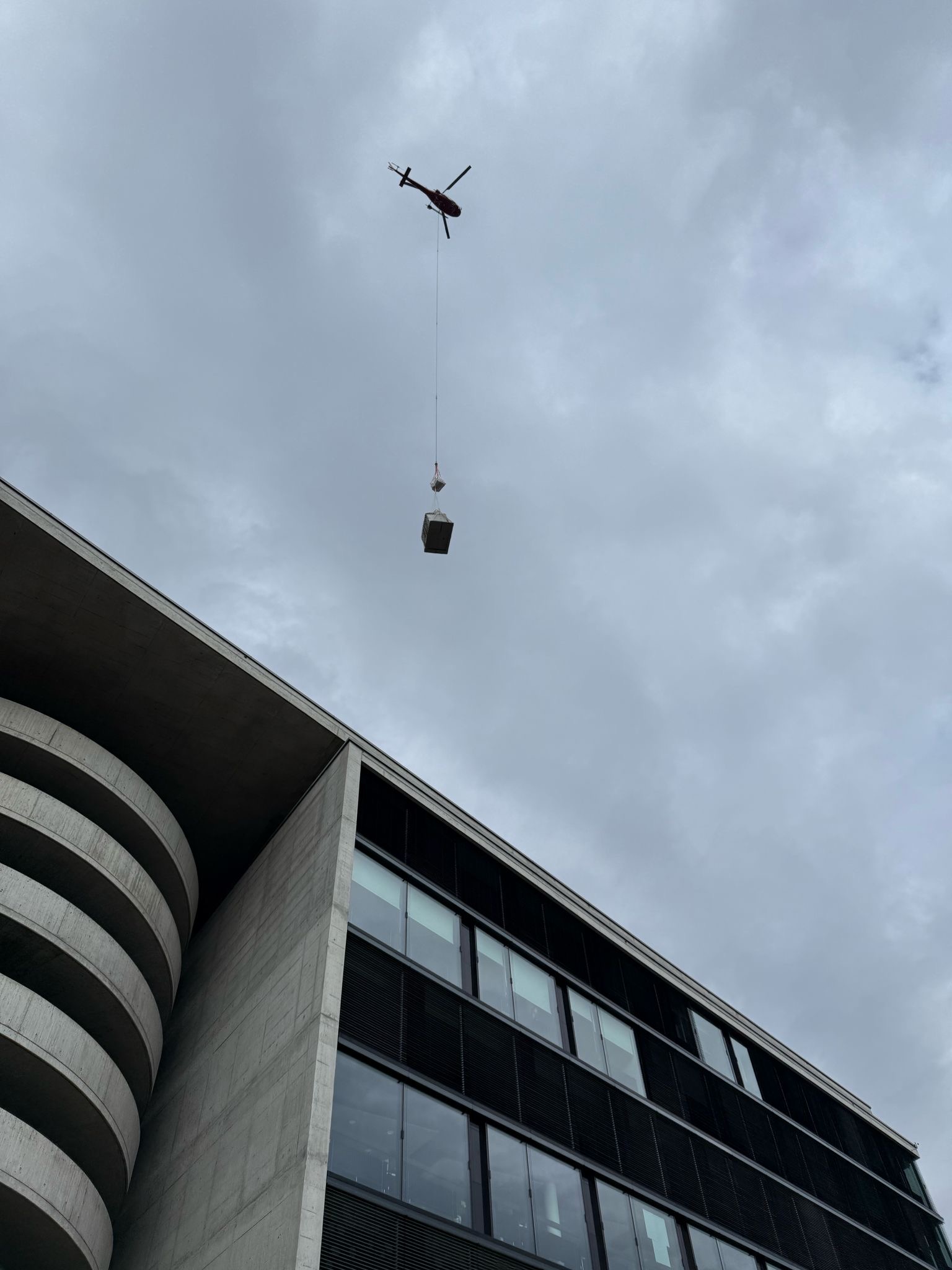 Die Herausforderung: Die Installation der neuen Ventilatoren auf dem Dach war ohne Kran oder Treppenhaus schwer möglich. Als innovative Lösung setzten wir einen Helikopter der Swiss Helicopter AG ein, der die alten Bauteile abtransportierte und die neuen Komponenten direkt aufs Dach lieferte. In enger Zusammenarbeit mit der Swiss Helicopter AG, spezialisierten Partnerfirmen, Behörden und der Flugsicherung wurde das Projekt sicher und effizient umgesetzt.