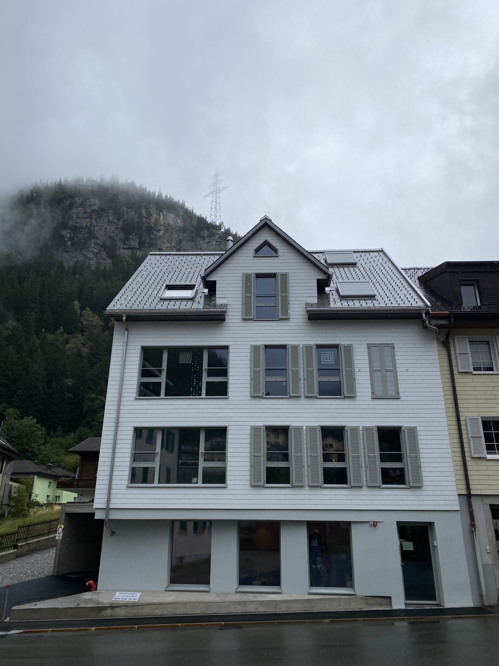Die Überbauung an der Gotthardstrasse in Göschenen, dem Eingangstor zur Gotthardregion, umfasst ein Mehrfamilienhaus mit drei modernen Wohnungseinheiten sowie ein Gästehaus mit fünf Wohnungen, zwei zusätzlichen Zimmern und einem grosszügigen Gemeinschaftsraum.