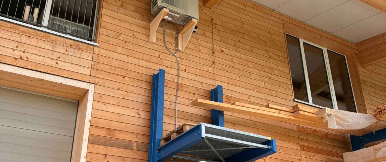 Das Aussengerät wurde mit einer speziell angefertigten Halterung aus Holz montiert. Gefertigt direkt vom Schreiner fügt sich die Konstruktion perfekt in die Umgebung ein und sorgt für ein stimmiges Gesamtbild.